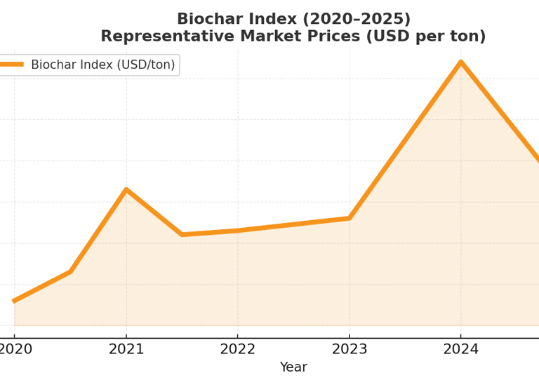 Between 2020 and 2025, biochar prices rose sharply from around $30 per ton in early 2020 to a peak of nearly $320 per ton in 2024, before stabilizing near $150 per ton in 2025. Interest grew rapidly as biochar emerged as a credible carbon removal solution. In 2021, prices surged toward $165 per ton as corporate climate strategies began including durable carbon storage. The momentum was reinforced by international initiatives—such as India’s launch of its first state-supported biochar program and Google’s deal to buy carbon removal credits from Indian farms—signaling mainstream adoption.