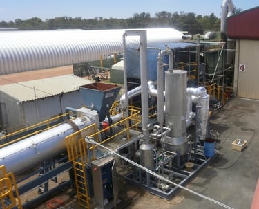 Feedstock is introduced via controlled screw feeding to ensure consistent throughput and residence time. Solid products are cooled in a jacketed screw conveyor and collected under airtight conditions, while off-gas is thermally oxidised in the SACTO before release.