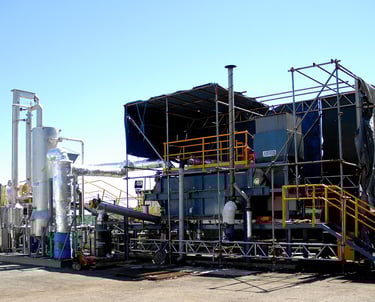 The Anergy test facility is centred on an HK510X indirect-fired rotary kiln operated in series with a horizontal direct-fired kiln acting as a pyrolysis gas combustor, known as a SACTO.