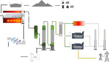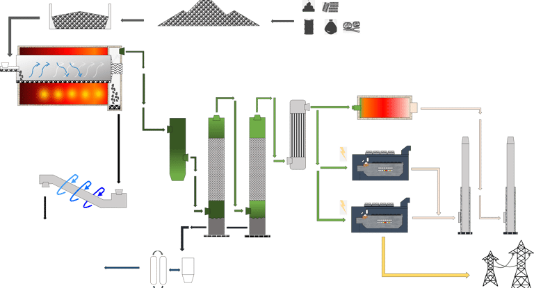 Gas Cleaning GCU Subsystem clean and scrub raw syngas in four stages to remove remaining tars and dust to ensure a clean emissions profile when re-fired in the kiln or consumed downstream.
